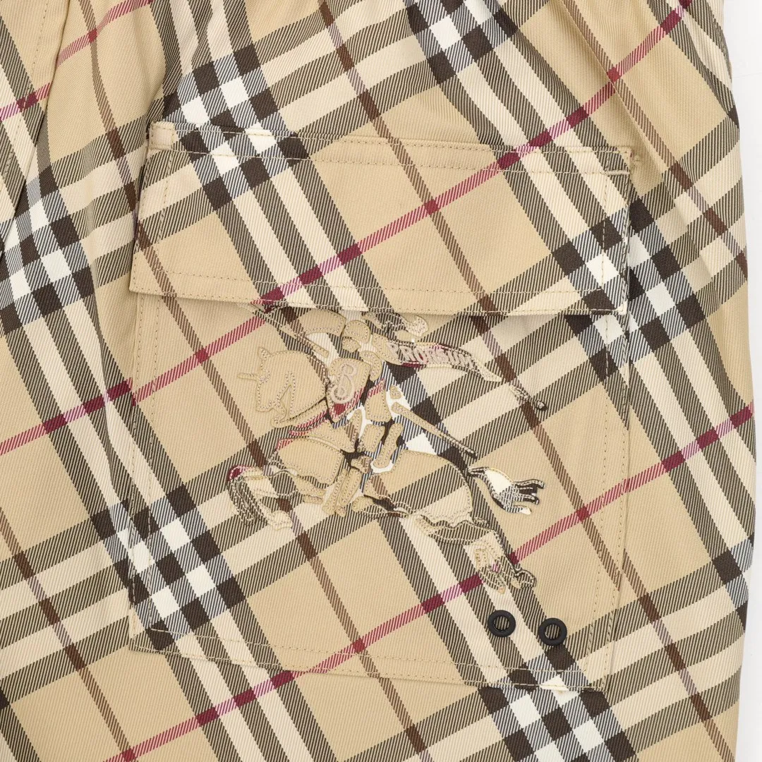 Channeling classic heritage with a modern edge, these Burberry shorts feature the iconic archive check pattern reimagined in a diagonal layout. The design includes a knight motif embroidered subtly over the back pocket for a distinctive brand touch. Lightweight and fast-drying, they’re finished with an elastic waistband and side adjusters, ideal for both city strolls and coastal escapes.