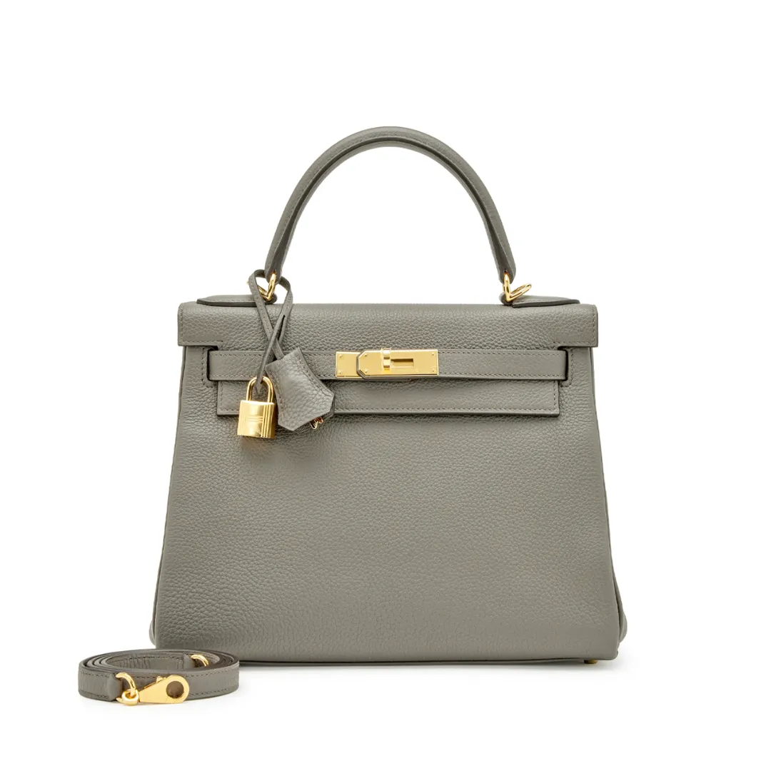 Description: The Kelly bag is a symbol of luxury, distinguished by its trapezoidal shape and structured silhouette. The bag is defined by its signature details such as the side straps, swivel clasp, and sturdy top handle. The Kelly is a masterpiece of craftsmanship, representing timeless beauty and absolute elegance.