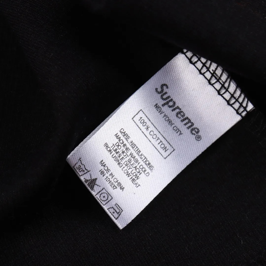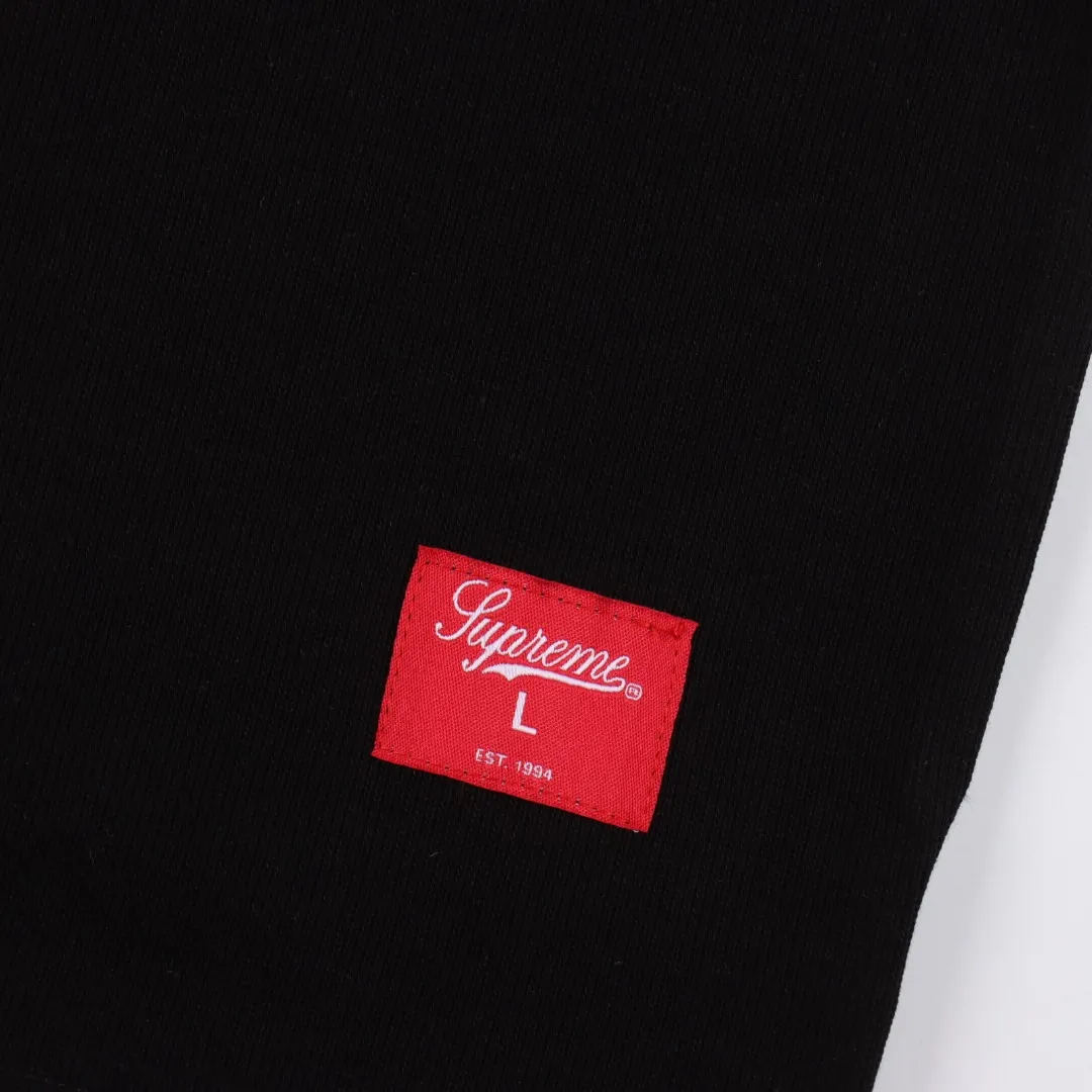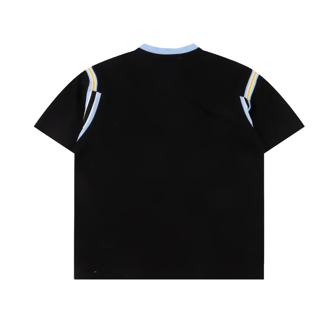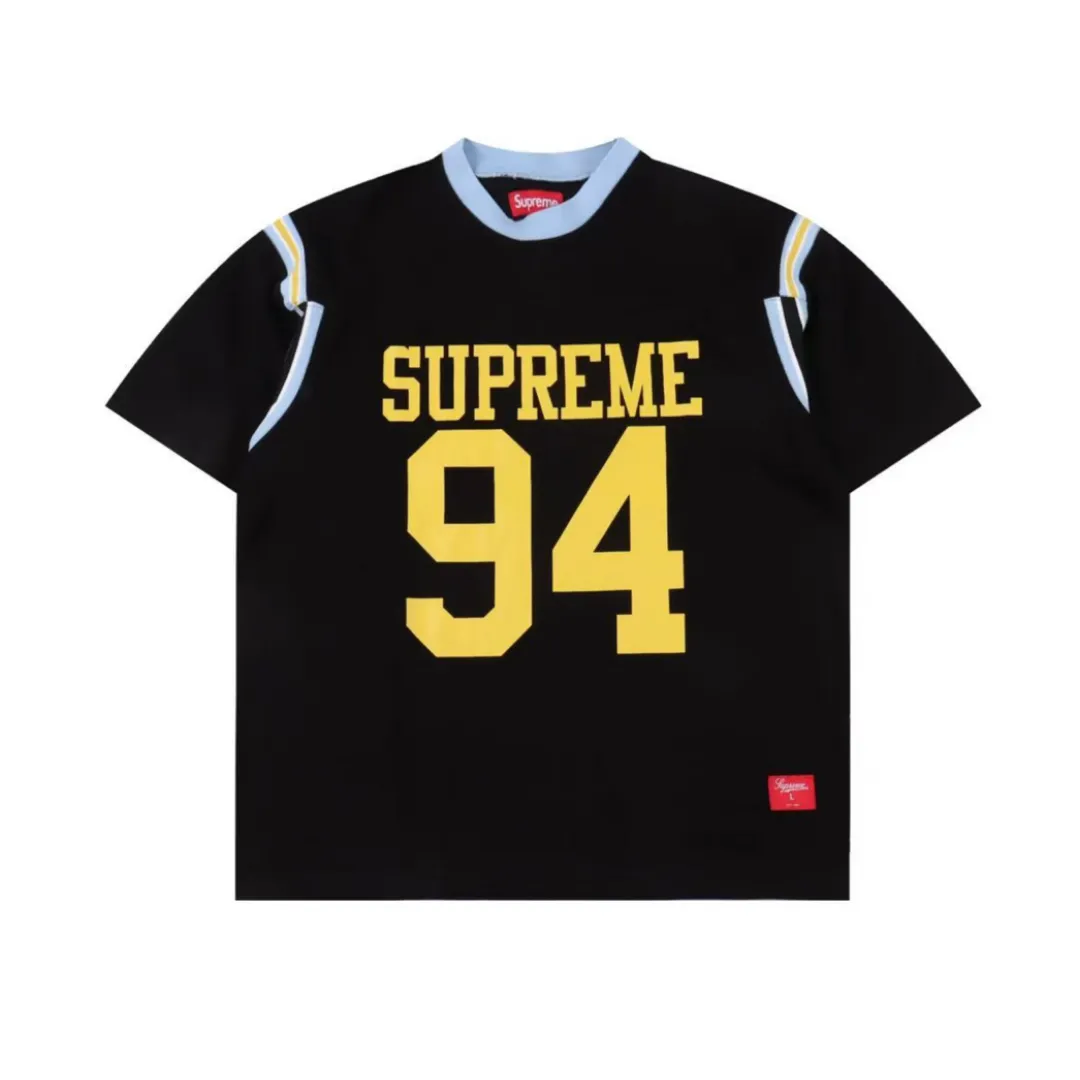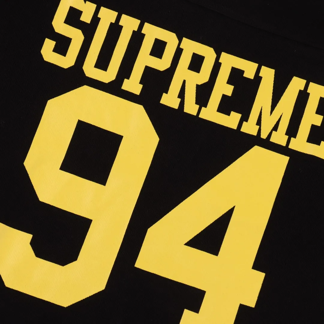 Bold and nostalgic, this SUP jersey-style tee channels varsity energy with a modern twist. Dominated by a standout “94” on the chest, it’s paired with the signature SUP branding in vibrant yellow for maximum contrast. Light blue ribbed collar and shoulder stripes add athletic vibes, while the premium black cotton base delivers everyday comfort with a luxe streetwear finish. Finished with the iconic SUP red label at the hem.